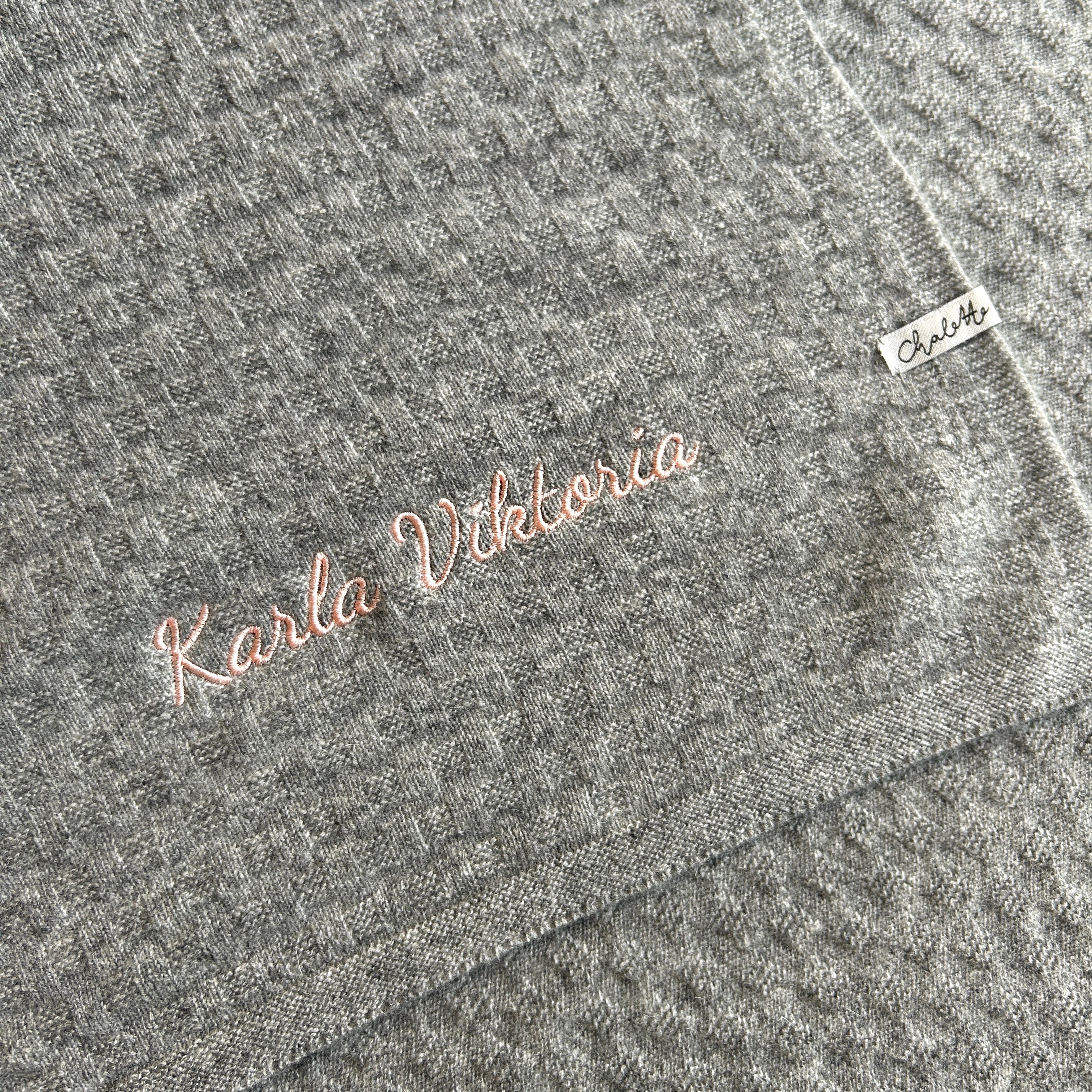 Mit dem Kauf einer unserer Decken hast Du auch die Möglichkeit unseren Stick-Service zu nutzen, um Deine Decke individuell zu gestalten. Ob Name, Datum, Kosewort oder ein anderer Begriff – wir besticken Deine Decke nach Deinen Vorstellungen.