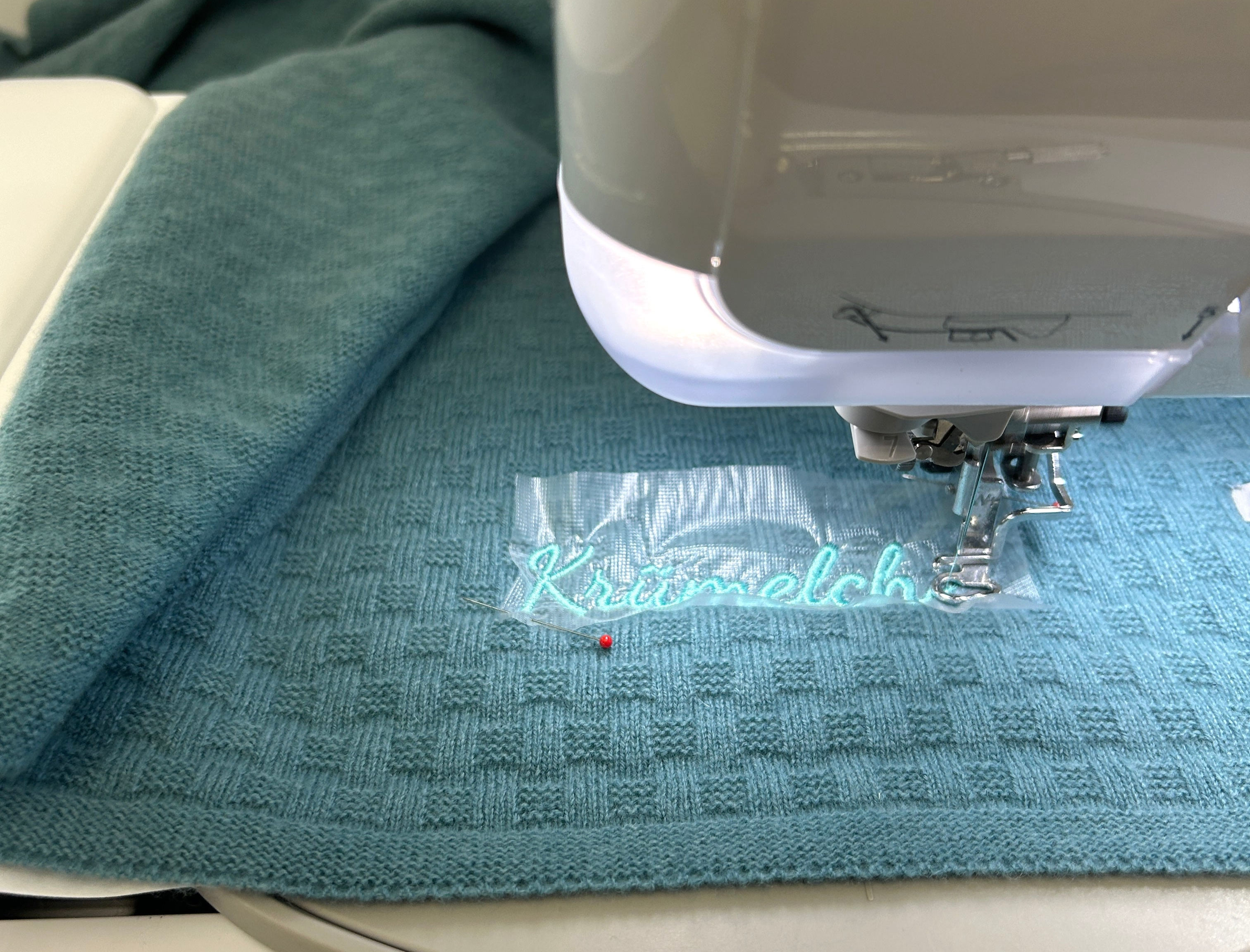 Ist die Stickerei fertig, entfernen wir das Vlies sorgfältig. Bei Bedarf lösen wir die Reste sanft mit Wasser auf. Nach dem Trocknen wird Deine Decke liebevoll verpackt und macht sich auf den Weg zu Dir.
